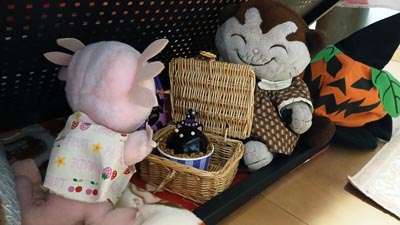 この後、シロカブや他のみんなもスイーツを食べました。 ちょもたちは家のあちこちに秘密基地があるちょも♪今回はテーブルの下だったちょもね。