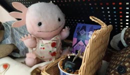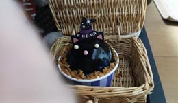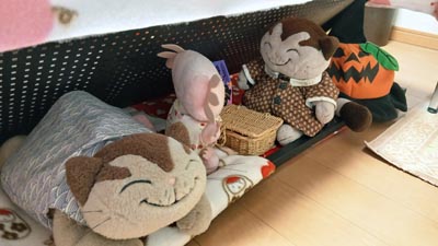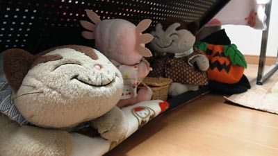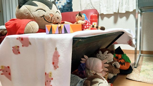 この後、シロカブや他のみんなもスイーツを食べました。 ちょもたちは家のあちこちに秘密基地があるちょも♪今回はテーブルの下だったちょもね。